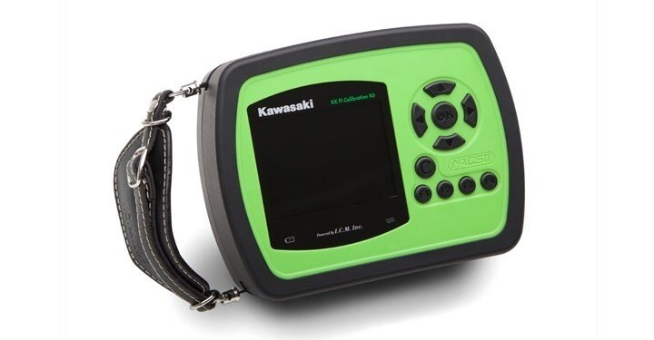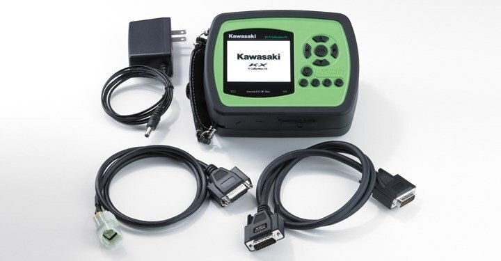 The KX FI Calibration Kit features a handheld KX FI Calibration Controller which enables riders to adjust engine characteristics, by rewriting actual data maps, to suit their preference